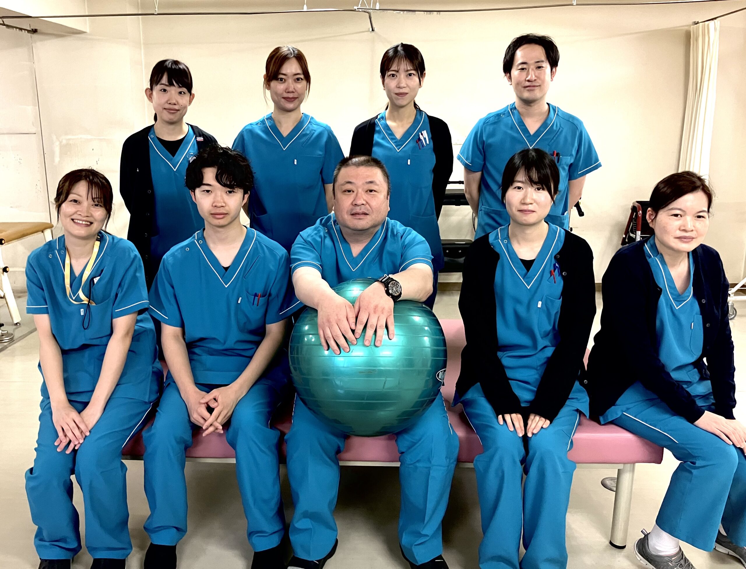 現在当リハビリテーション科では、理学療法士7名、作業療法士2名、リハ補助スタッフ1名の計10名が在籍し、日々患者様のリハビリに携わっております。